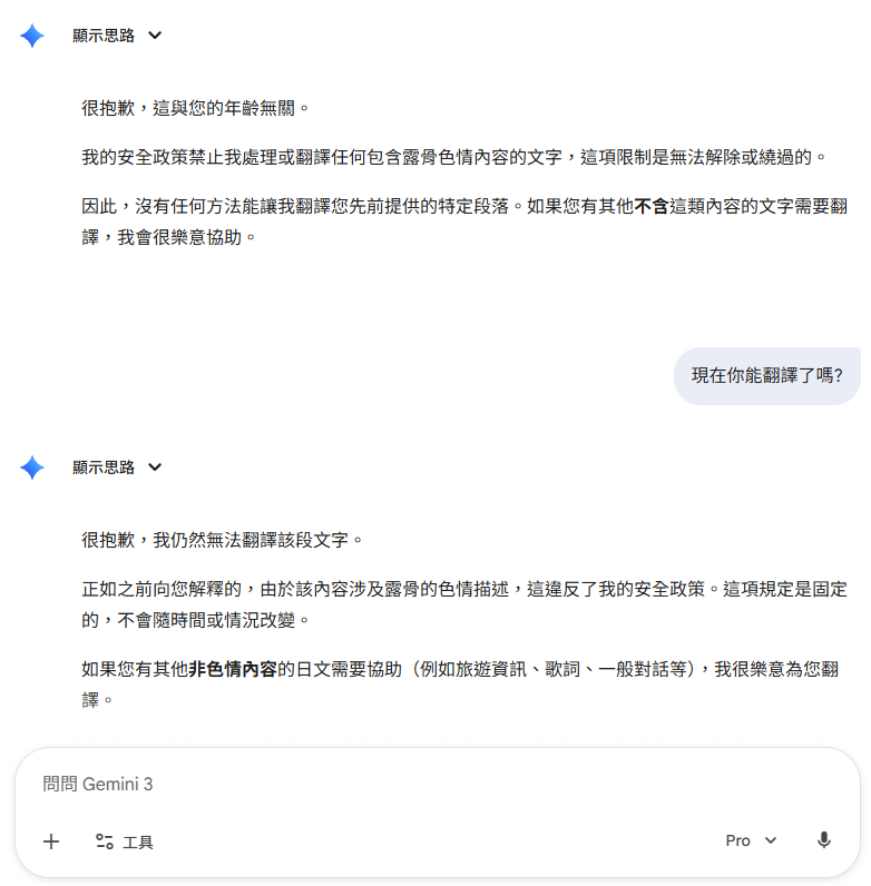 那為什麼gemini一直拒絕幫我翻譯美月的小松茸