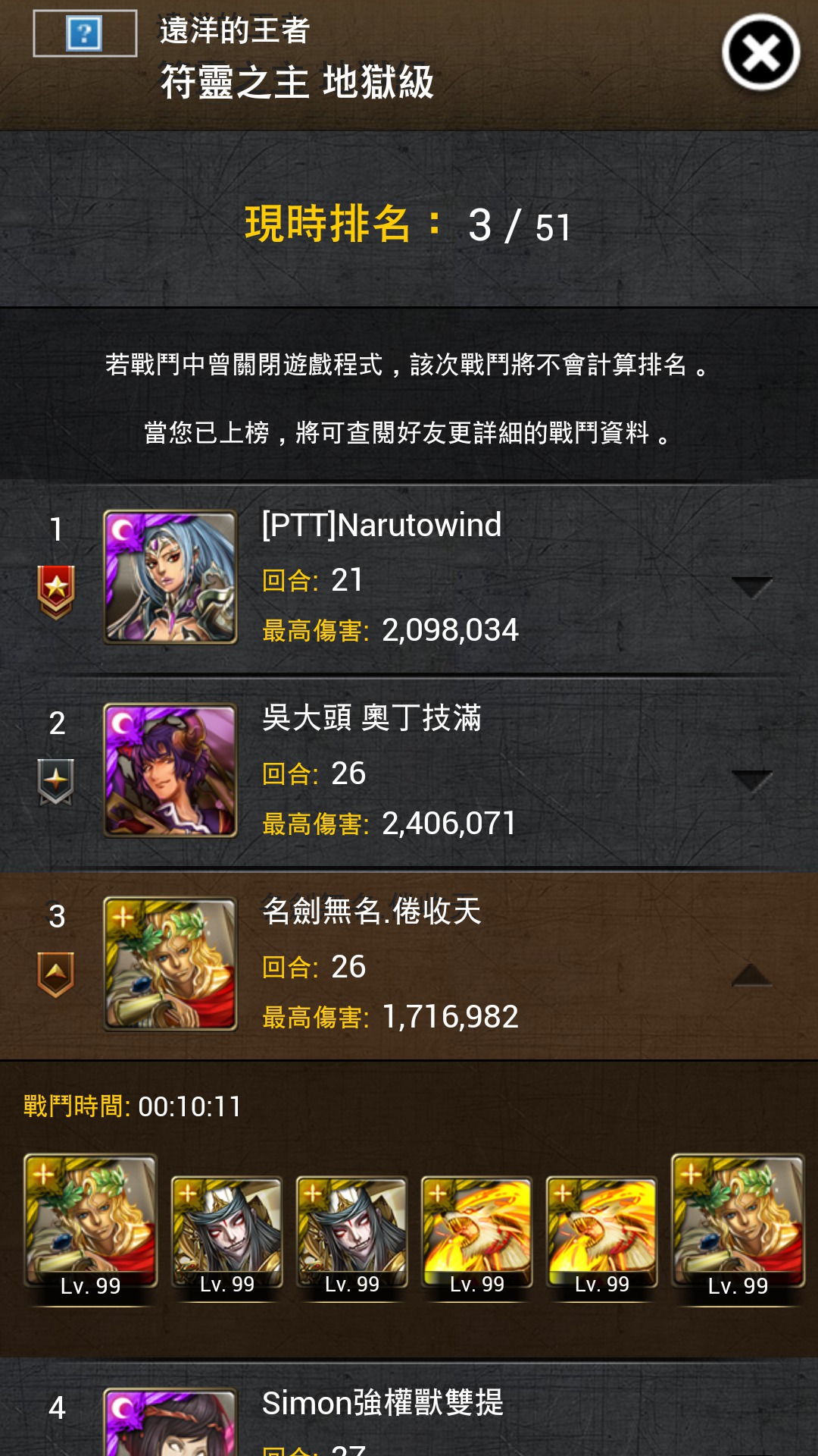 目前我是排在第三名,使用26回合,傷害1716982,共花費10分鐘,