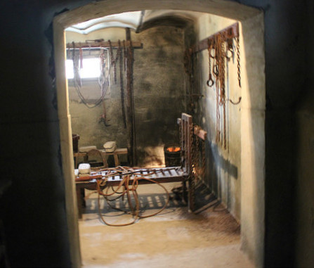 地下室看起來就像是個土砲的刑訊室,舉目可及隨處都是各種粗糙的拷問器具:各種金屬