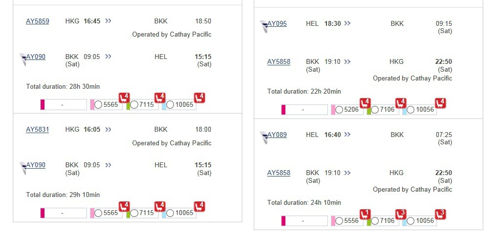 報告板大,我也是在這個網站查的,我查了超過10個不同的出發回程日期,只要是香港飛HEL全部都要停BKK,板大你有點進去看過嗎? 會不會是今年改成沒直飛了 ?大大,我看懂這網站的意思了,我一直以為網頁下半部是詳細行程, 其實上半部就是直飛的了, 下半部是另外的航班要在 BKK轉機, 多謝板大, 是我耍白痴~~~~哈哈哈